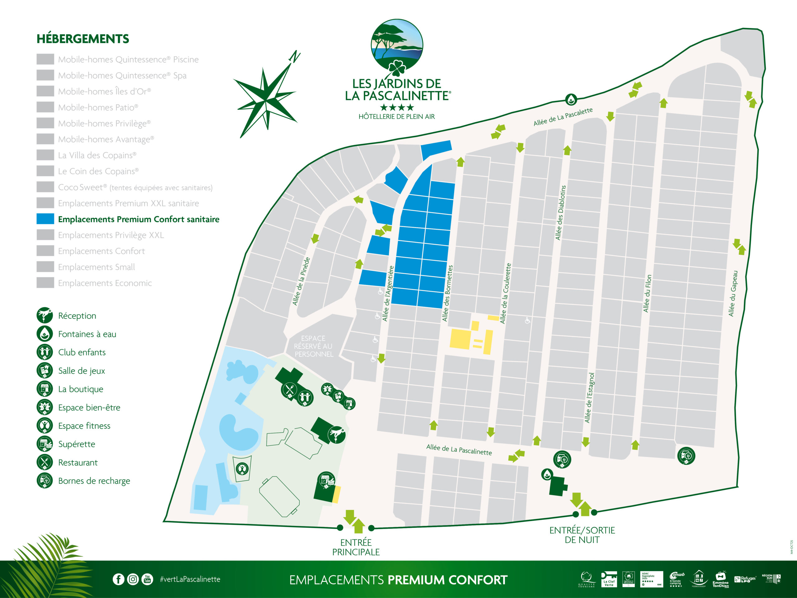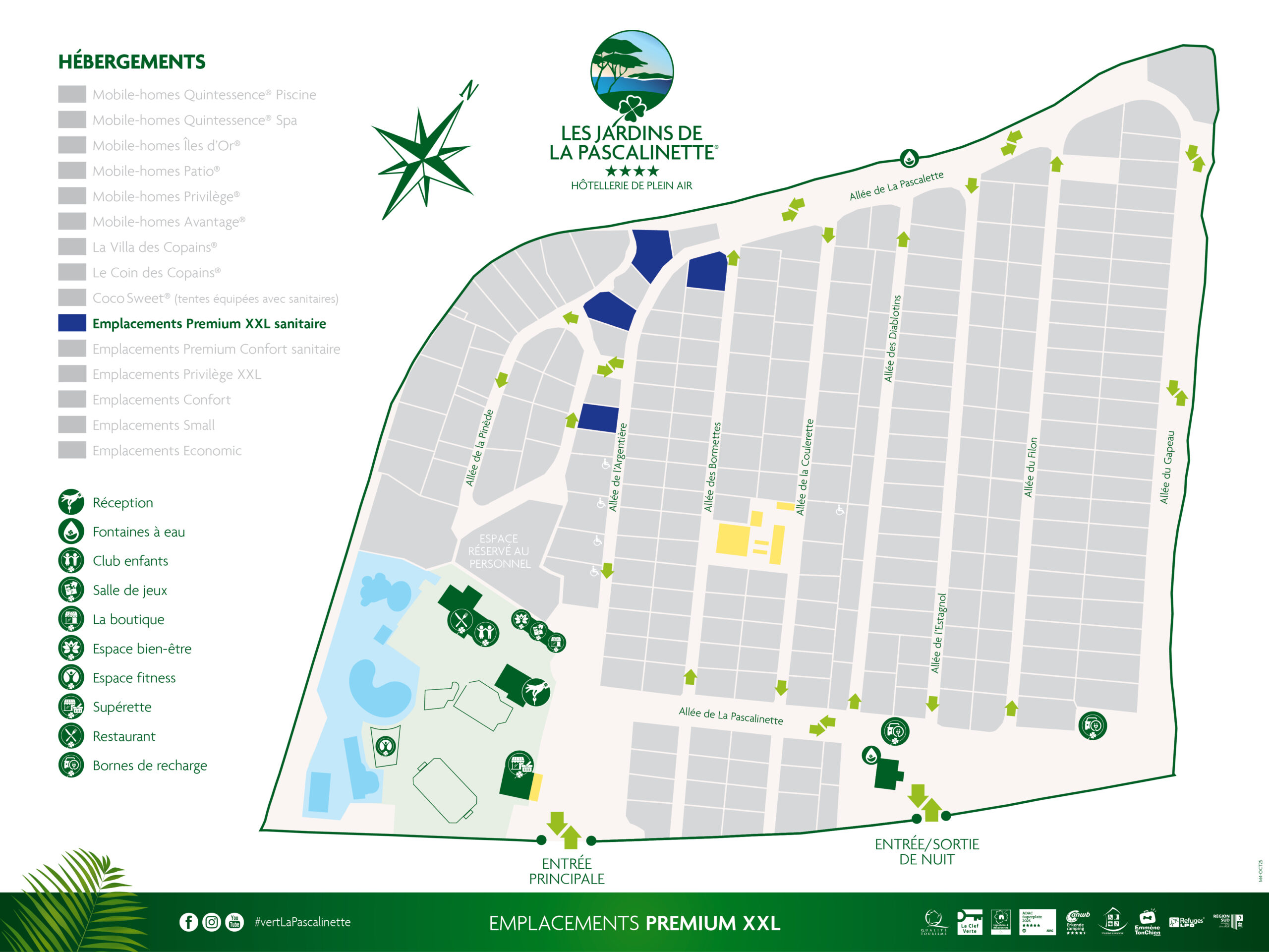 Located in the campsite’s prettiest areas, our Premium Confort and Premium XXL pitches offer a peaceful environment in the sunshine or shade, in the heart of our Exceptional Vegetation, while remaining close to the campsite’s essential services: the vast water park (2,000 m²), entertainment, mini market, boutique, restaurant and activities.