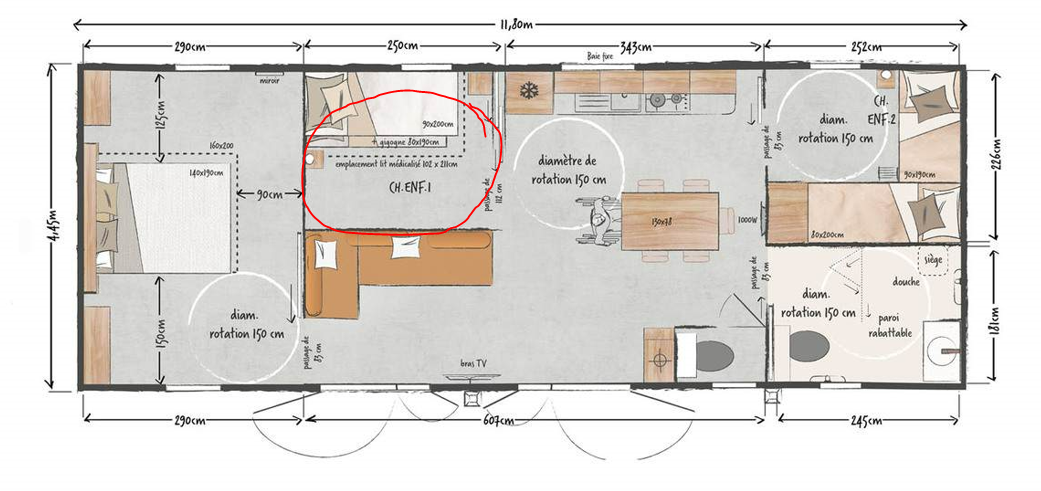 Our campsite offers five PRM mobile homes, accessible to guests in wheelchairs.
